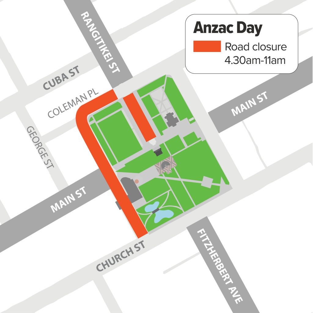 Road closures will be in place around Te Marae o Hine – The Square during the morning to safely accommodate the services and parade. There will also be temporary road closures in Ashhurst to support the services there.